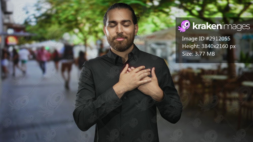 Man with hands on chest on a busy street restaurant terrace, eyes closed in a soft smile; gratitude mindfulness reflection.