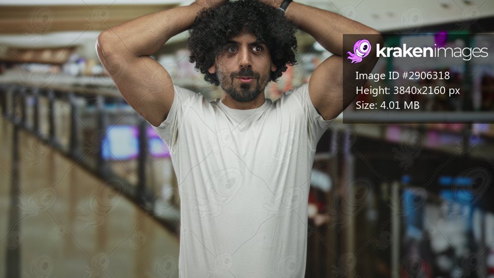 Man with hands on head, exposed arms and biceps, wearing white tshirt in a shopping building; surprised curiosity attention.