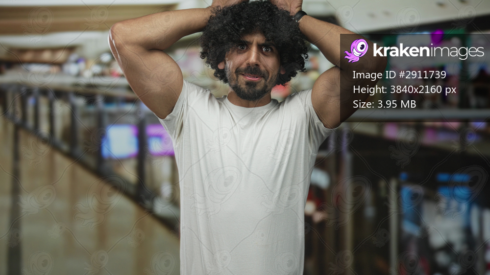 Man with hands on head, exposed arms and biceps, wearing white tshirt in a shopping building; surprised curiosity attention.