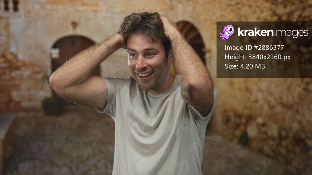 Man with hands on head smiling broadly and fists raised in celebration, wearing a casual tshirt while standing outdoors on a sunlit stone street in a historic town; joy celebration optimism. - Kraken Images