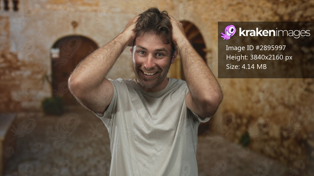 Man with hands on head smiling broadly and fists raised in celebration, wearing a casual tshirt while standing outdoors on a sunlit stone street in a historic town; joy celebration optimism. - Kraken Images