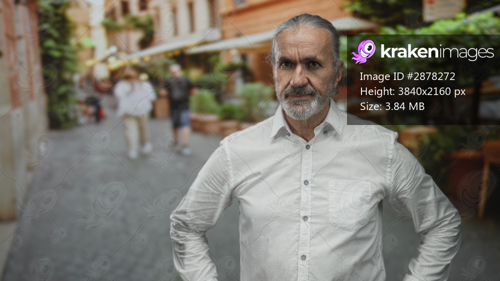 Man with hands on hips, hoary long hair tied back and gray beard, in white shirt on cobblestone street outside cafe; quiet contemplation.
