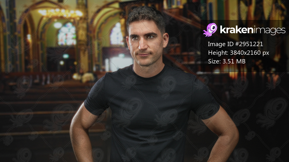 Man with hands on hips looking down inside catholic church building by stained glass windows; contemplative solitude.