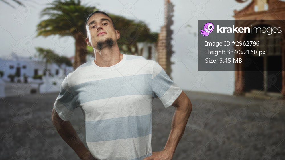 Man hands on hips posing in a sunlit street plaza beside an arched building, striped tshirt visible; confidence poise.