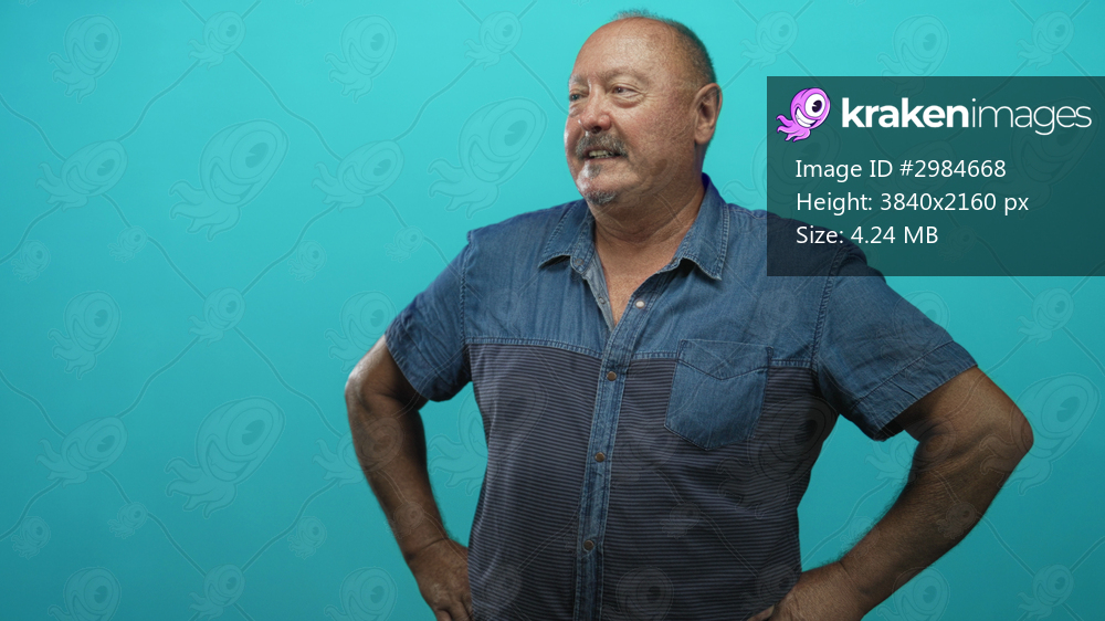 Man hands on hips, smiling and looking aside in studio against turquoise backdrop wearing denim shirt; warm confidence.