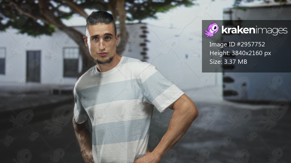 Man with hands on hips wearing a light blue and white striped t shirt standing in a narrow street by whitewashed buildings and a tree; confidence.