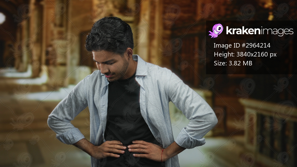 Man with hands on waist and closed eyes holding stomach in ornate building corridor with carved columns and balustrade; quiet discomfort.