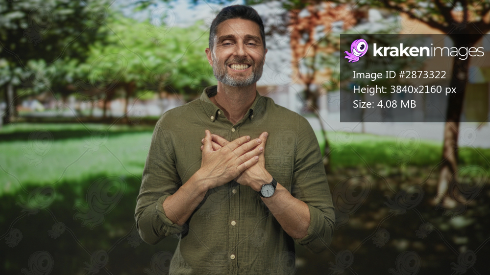 Man with hands over chest smiling with eyes closed in park green outdoors wearing olive shirt and watch bearded relaxed; gratitude kindness.