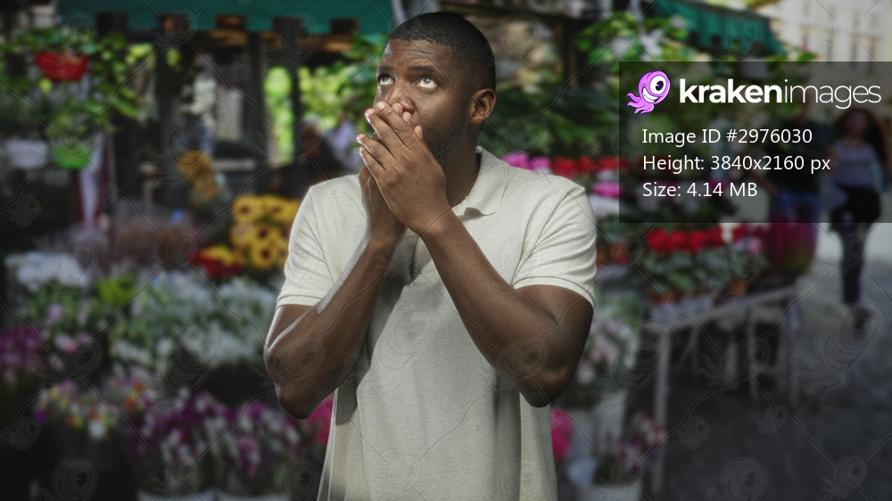 Man with hands over mouth at a busy street flower market stall, looking upward with tense expression and visible forearms and clenched fingers; surprise. - Kraken Images