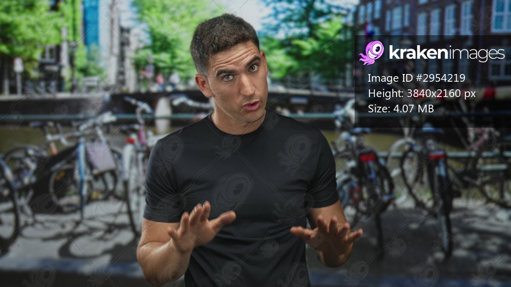 Man with hands palms out gesturing on amsterdam street beside parked bicycles and canal walkway; caution.