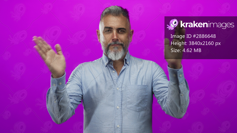 Man with hands pressed in prayer and closed eyes in magenta studio wearing button shirt; calm gratitude meditative reflection.