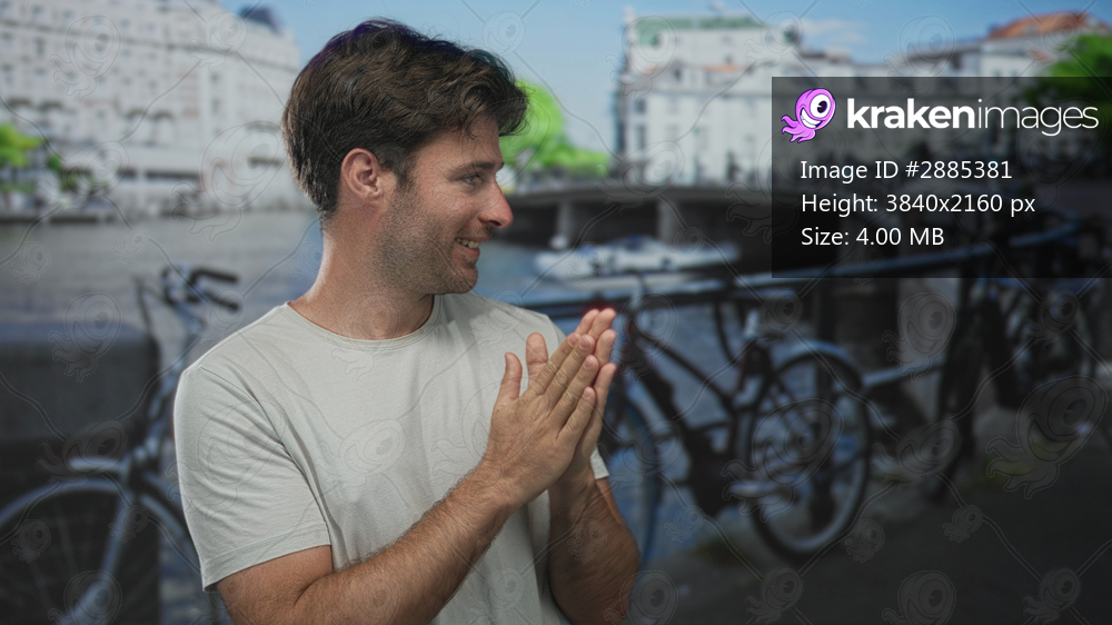 Man with hands pressed together clapping on a street in amsterdam beside canal and bridge; contentment travel relaxation.