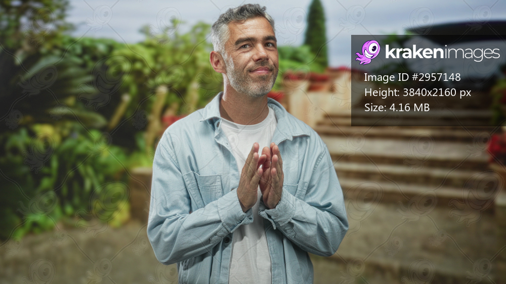 Man with hands pressed together in a prayerlike gesture on stone stairs of a building, grey hair and beard, casual light shirt, palms visible; quiet gratitude. - Kraken Images