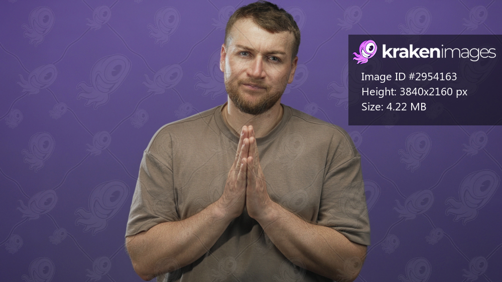 Man with hands pressed together in pleading gesture in studio against purple wall, young heavyset; hope humility.
