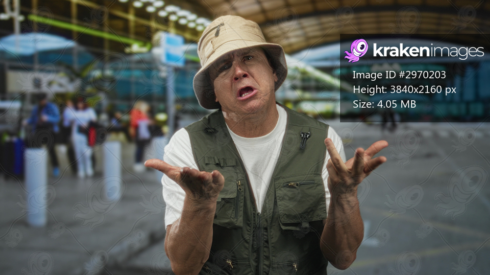 Man with hands pressed together in pleading pose at airport terminal wearing bucket hat and fishing vest, anguished expression; pleading regret.