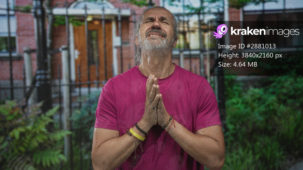 Man with hands pressed together in prayer at building entrance, eyes closed, head tilted upward in front of house gate; hope gratitude prayer.