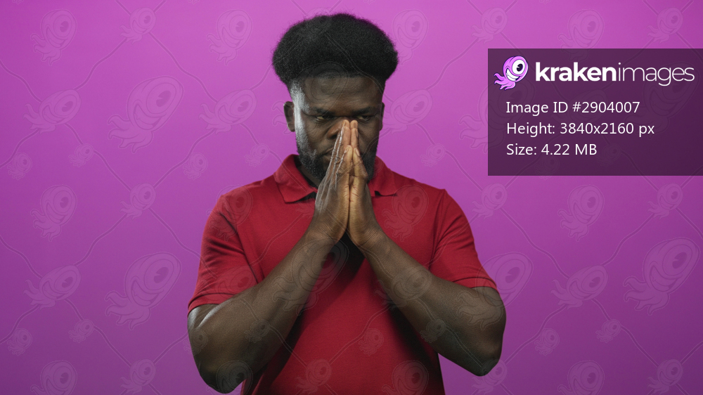 Man with hands pressed together in prayer, eyes closed and wearing a red polo, standing before a purple studio wall; contemplation.