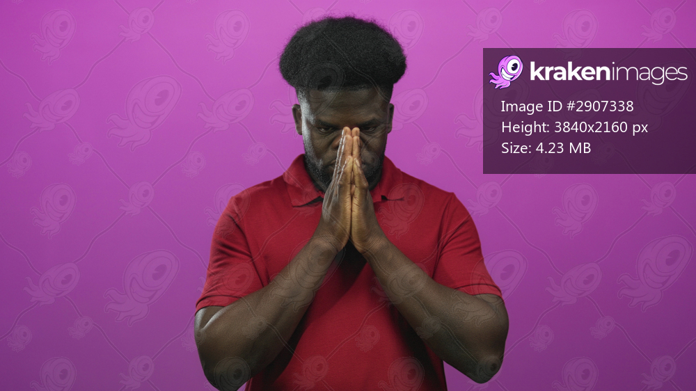 Man with hands pressed together in prayer, eyes closed and wearing a red polo, standing before a purple studio wall; contemplation.