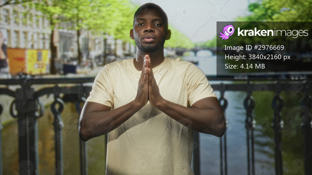 Man with hands pressed together in prayer gesture on a studio set portraying a canal bridge, smiling at camera in a light tshirt showing forearms; serenity gratitude. - Kraken Images