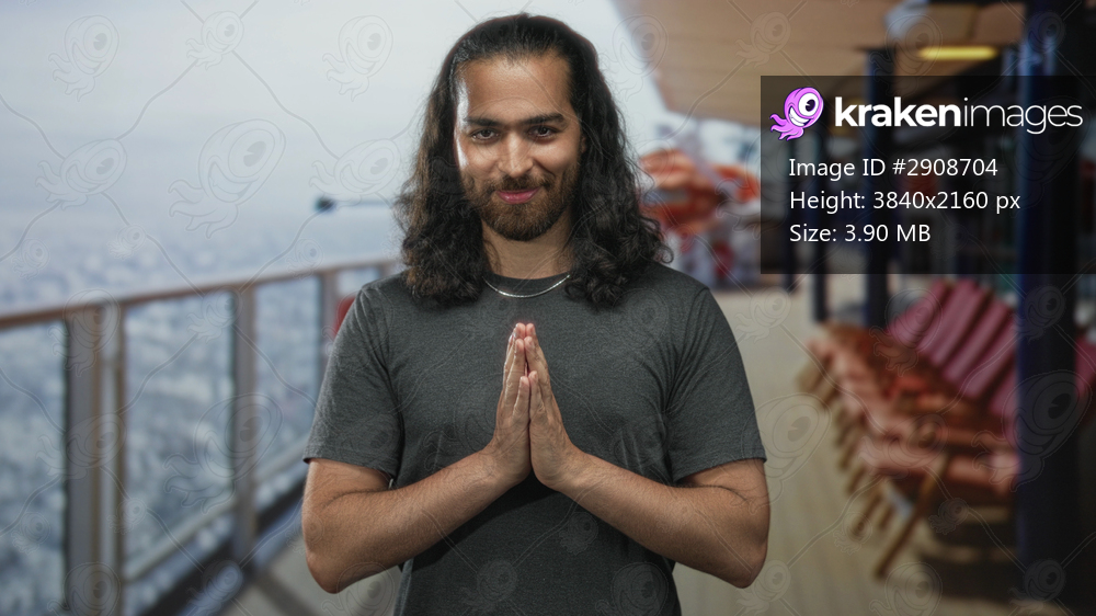 Man with hands pressed together in prayer gesture on cruise ship deck wearing gray t shirt and silver necklace; serenity contemplation.