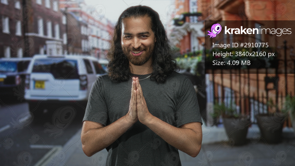 Man with hands pressed together in prayer gesture on street in front of parked car and window boxes; gratitude serenity.