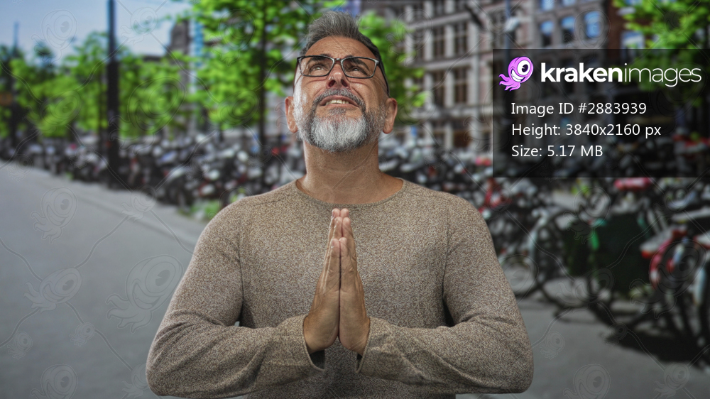 Man with hands pressed together in prayer gesture, wearing glasses, bare hands visible, looking up on an amsterdam street beside rows of parked bicycles; hope faith. - Kraken Images