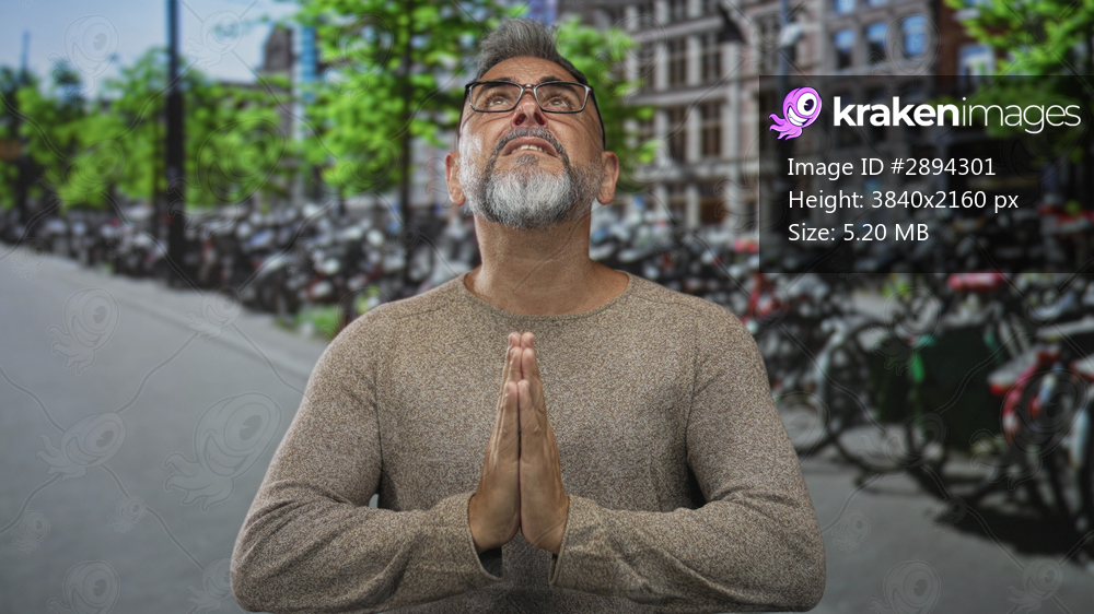 Man with hands pressed together in prayer gesture, wearing glasses, bare hands visible, looking up on an amsterdam street beside rows of parked bicycles; hope faith. - Kraken Images