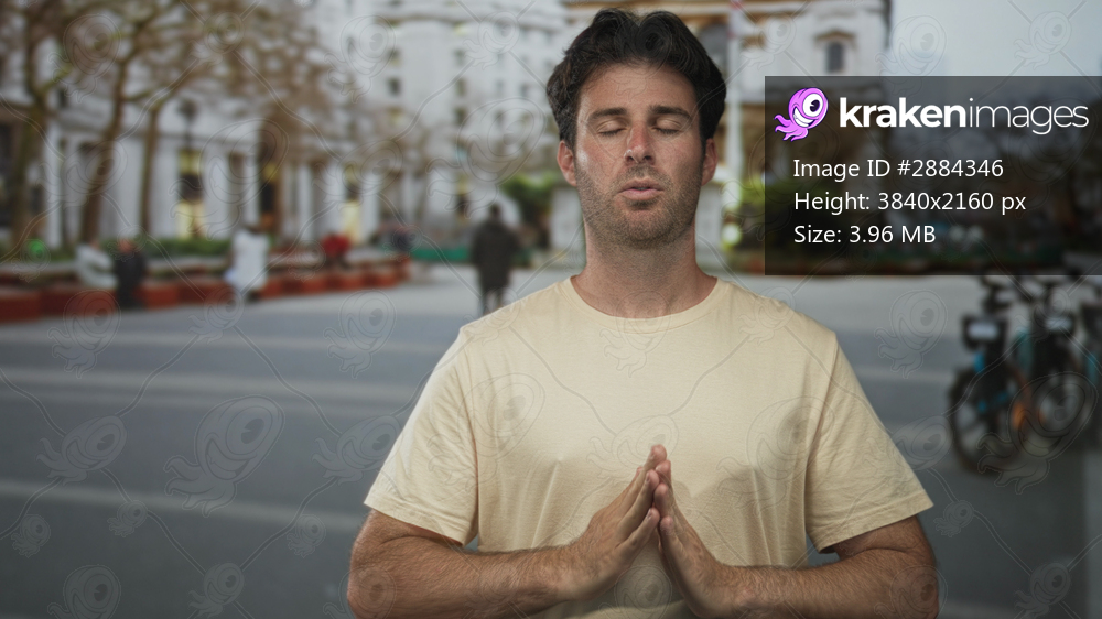 Man with hands pressed together in prayer on a busy city street near parked bicycles and plaza seating; calm mindfulness practice.