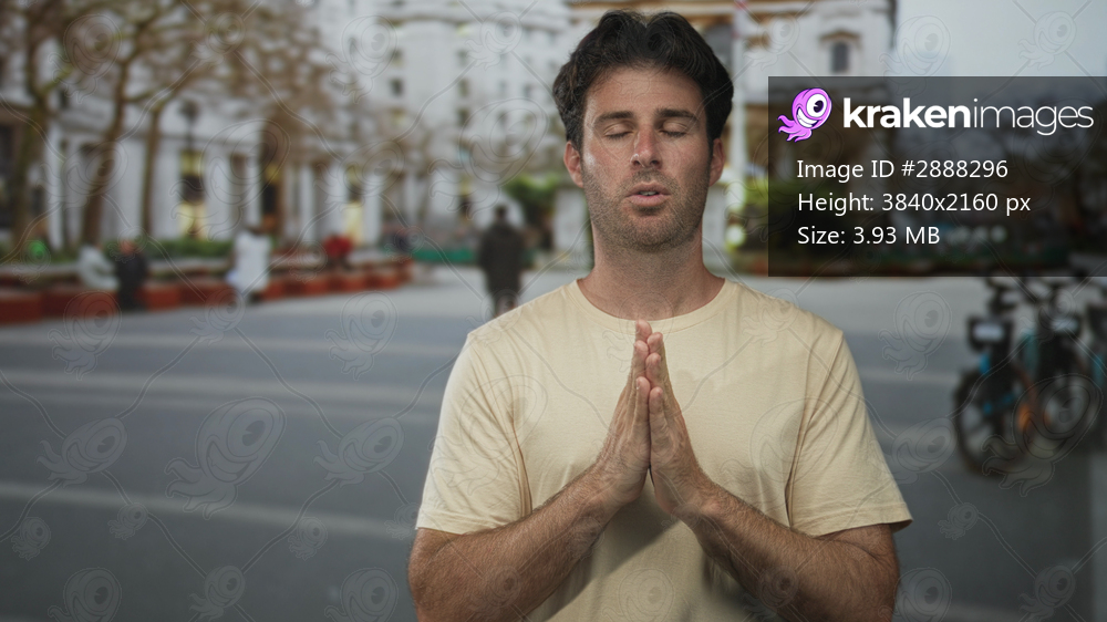 Man with hands pressed together in prayer on a busy city street near parked bicycles and plaza seating; calm mindfulness practice.