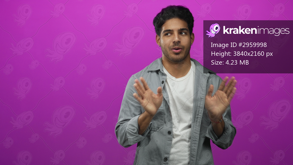 Man with hands pressed together and palms visible near mouth, smiling in a purple studio wearing a gray overshirt and white tee, mid gesture; playful.