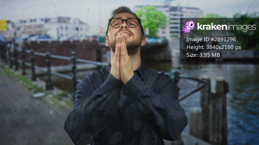 Man with hands pressed together praying on street in amsterdam canal area; seeking forgiveness hopeful.