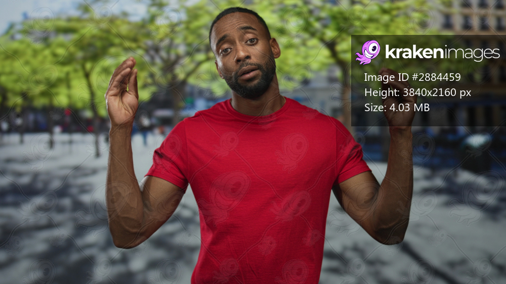 Man with hands raised and bare forearms visible on street in red tshirt, outdoors and young; thoughtful reflection.