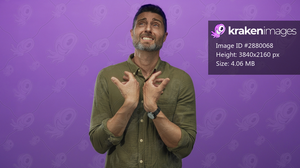 Man with hands raised and eyes closed wearing olive shirt and wristwatch, showing tense facial grimace in a purple studio; frustration plea.
