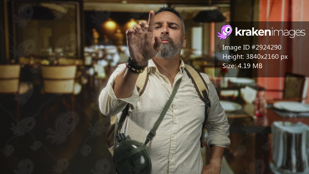 Man with hands raised framing gesture, backpack and canteen visible in restaurant building; exploration focus.