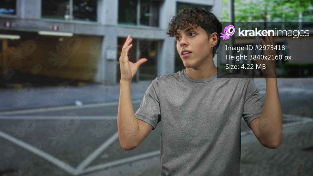 Man with hands raised gesturing while wearing gray t shirt, standing on street near a building entrance and curbside parking; curiosity reflection explanation. - Kraken Images