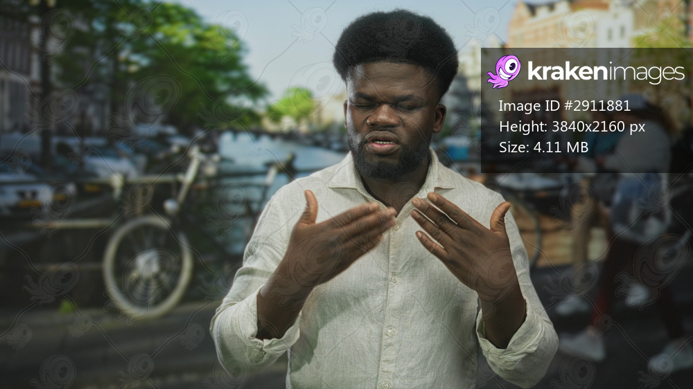 Man with hands raised in a pleading hand gesture by an amsterdam canal street outdoors in the city; frustration plea resilience.