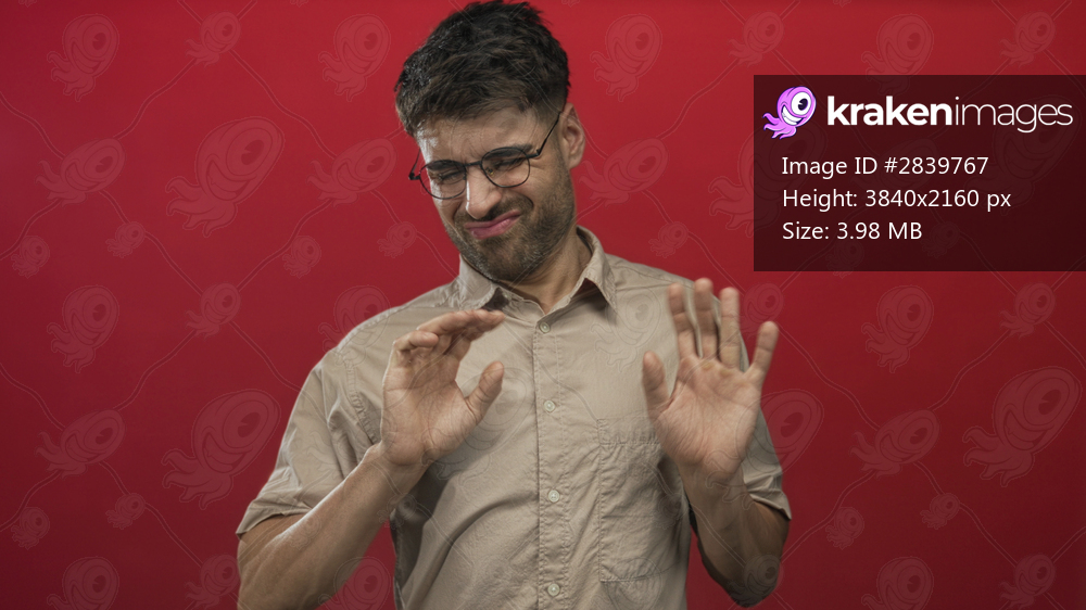 Man hands raised in repulsion gesture in red studio facing unseen threat as he recoils from unpleasant sight; disgust repulsion.