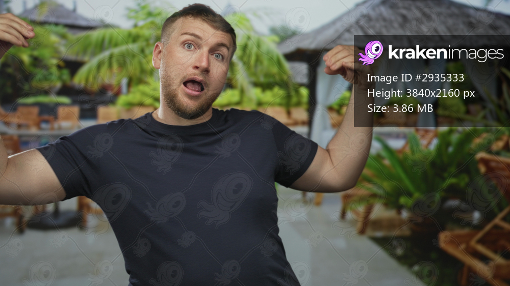 Man with hands raised and open mouth gesture at resort pool beside hotel building and cabana lounge chairs; surprise vacation leisure.