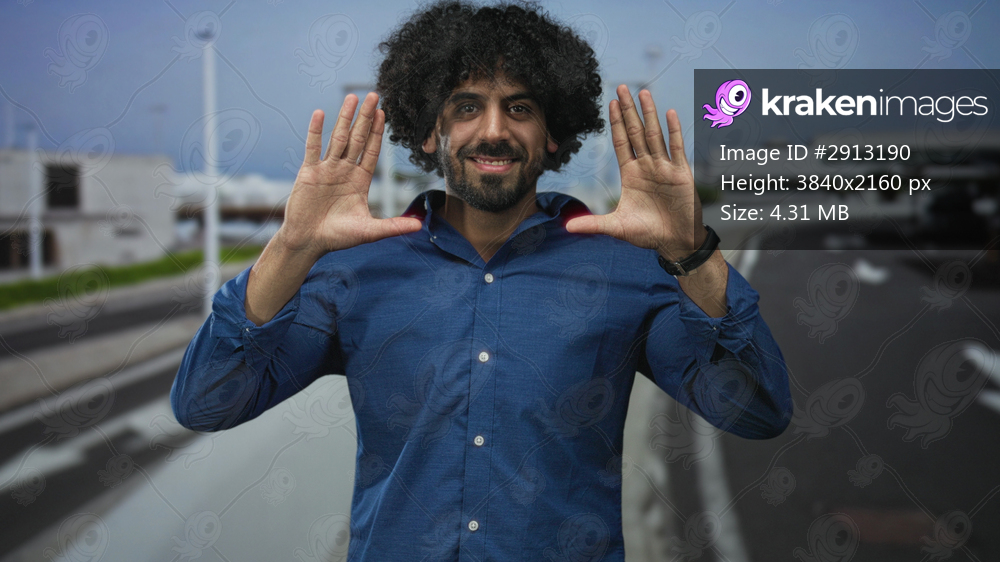 Man with hands raised palms facing camera at airport curb in blue shirt smiling with open palms; surprise playfulness.