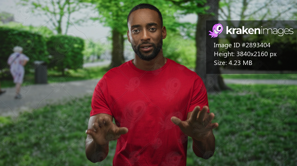 Man with hands raised palms forward at chest level in forest wearing red shirt looking at camera; calm reassurance.