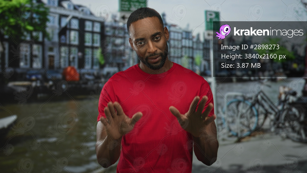 Man with hands raised palms forward wearing red shirt on street by amsterdam canal facing camera; reassurance trust connection.
