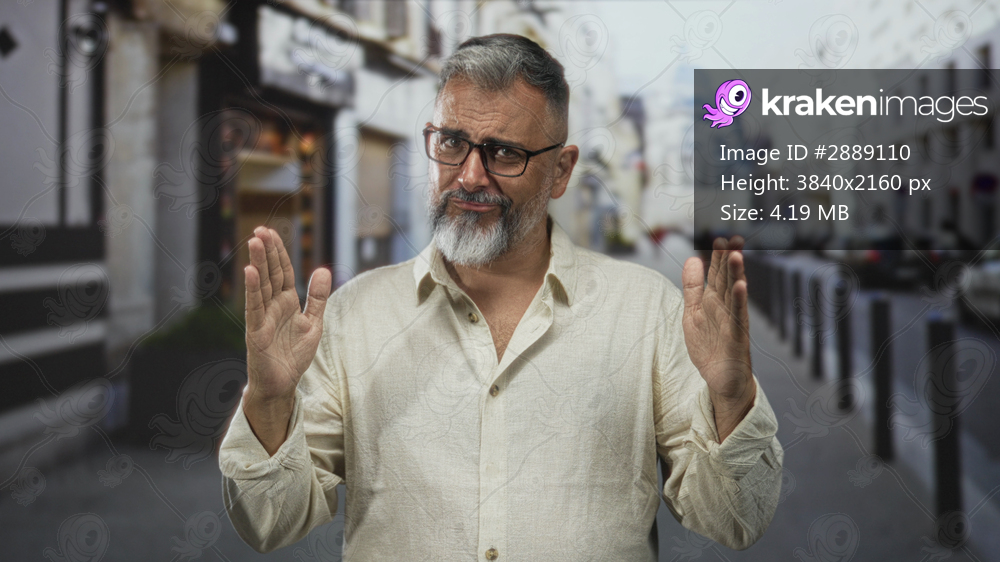Man with hands raised palms open on street, bearded wearing glasses and light linen shirt, gesturing palms forward; uncertainty hesitation.
