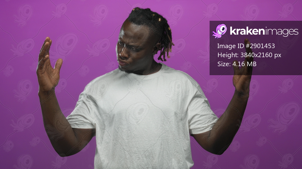 Man with hands raised palms out and furrowed brow in purple studio wearing white tshirt and dreadlocks; confusion contemplation.