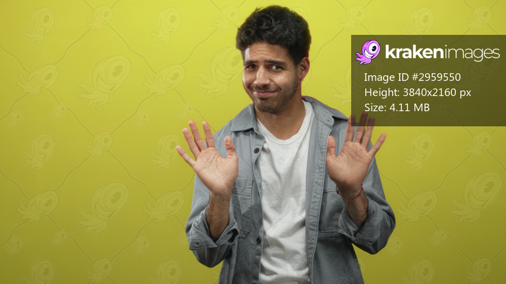 Man with hands raised palms out in studio against bright yellow backdrop, smiling with eyes closed; playful amusement.