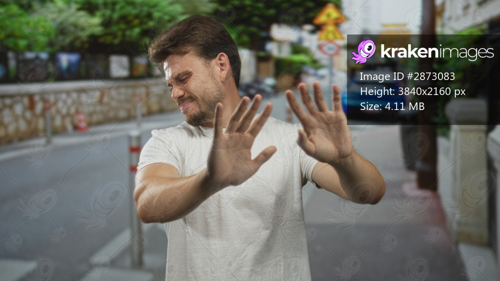 Man with hands raised palms out on a narrow city street wearing white t shirt, frowning and signaling stop and refusal; frustration.