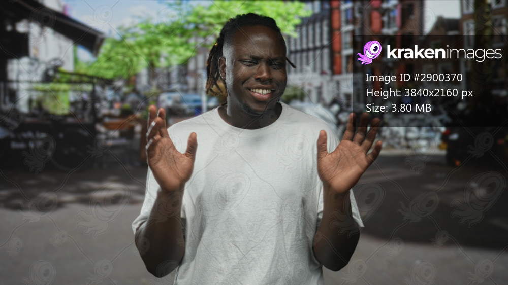 Man with hands raised, palms out on a street, eyes squinted and wincing while wearing a white t shirt; awkward hesitation.