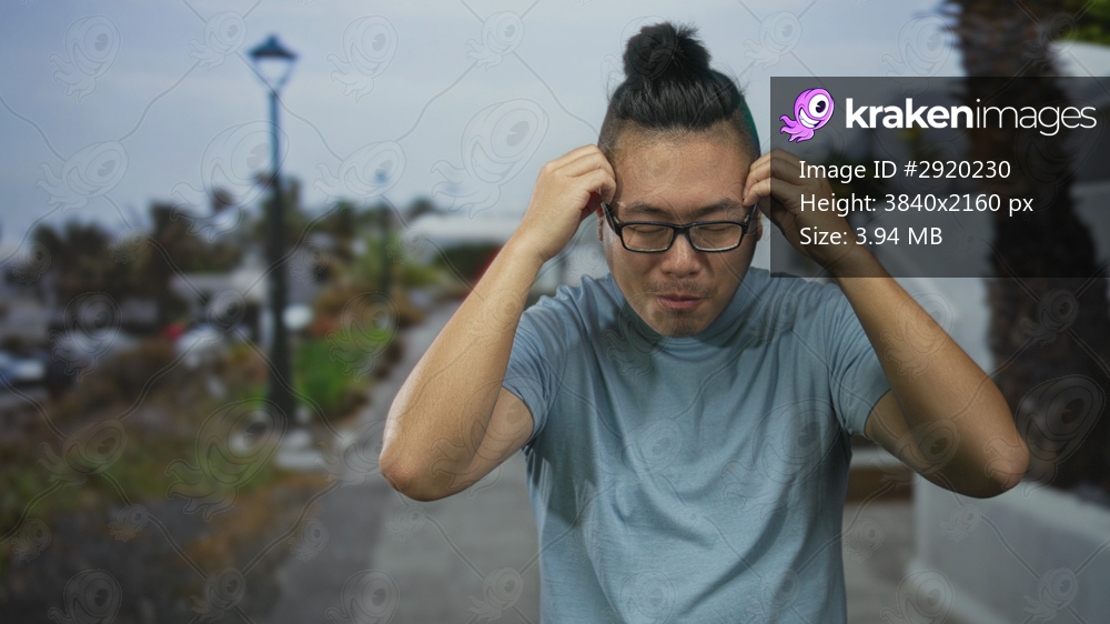 Man with hands raised and palms showing on a street beside a lamppost, wearing glasses and blue t shirt and a casual smile; confusion.