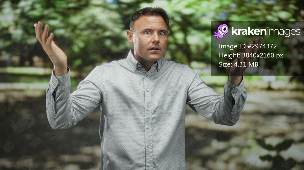 Man with hands raised palms up and arms open, shrugging and looking surprised while standing in a forest park setting; confusion uncertainty.