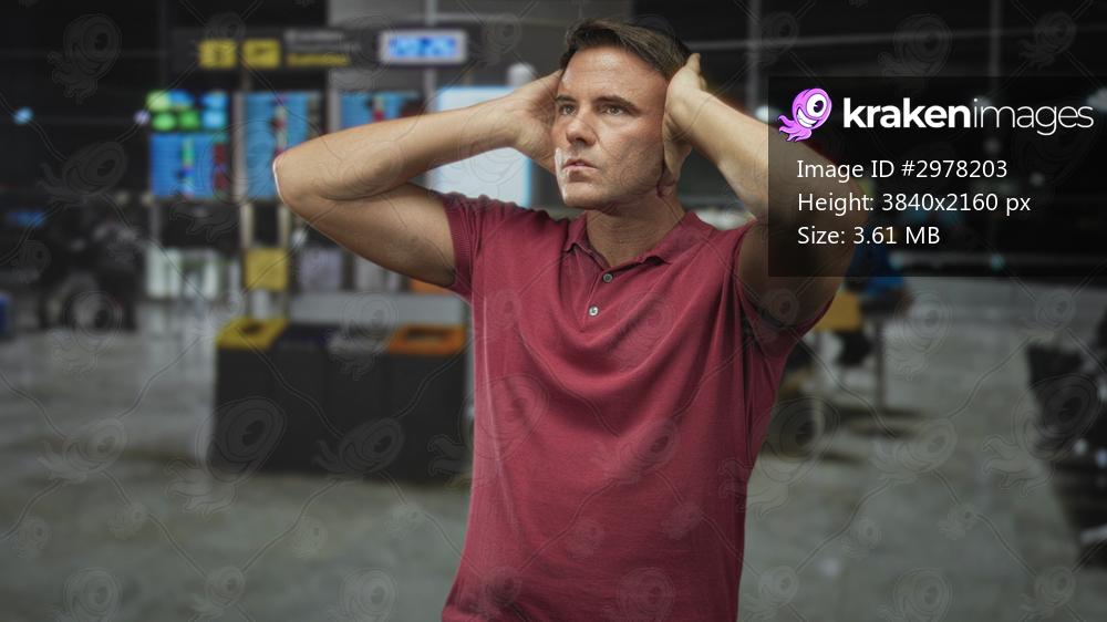 Man with hands to head at an airport terminal by flight information boards, looking upward in a tense pose; frustration delay travel.