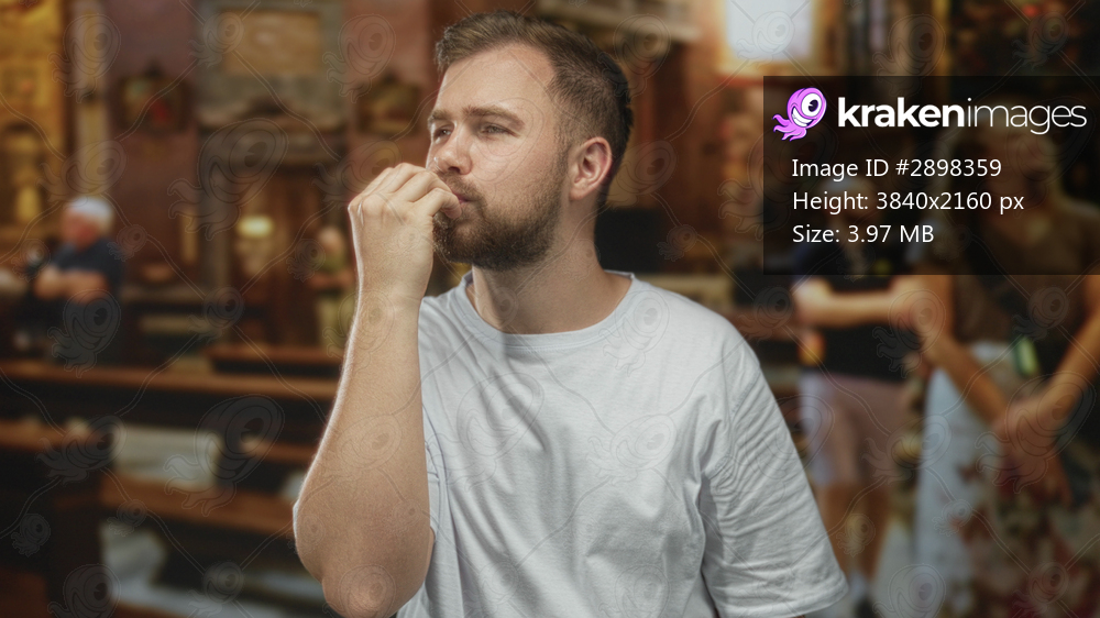 Man with hands to mouth and closed eyes in a church building among pews wearing white t shirt; serenity prayer reflection.